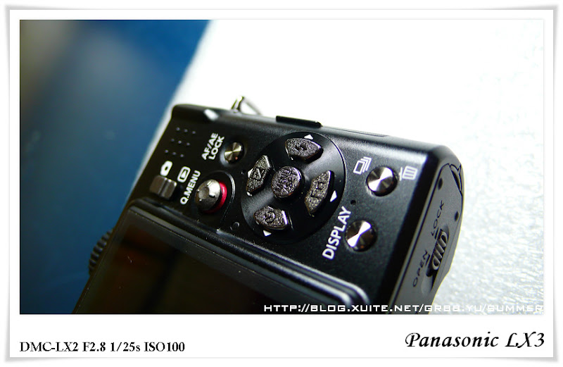 中間「MENU」、左邊「定時自拍」、右邊「閃燈」、上面「閃燈強度、EV值、包圍曝光」這些都和LX2一樣,但下面那個「FN」就不同了,