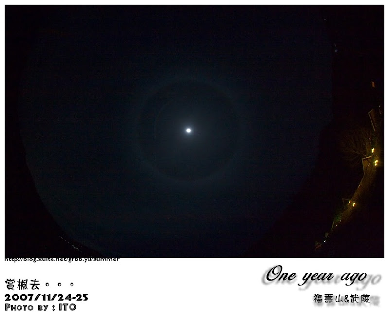 月亮超亮,配合山上的霧氣,在月亮周圍有一圈亮亮月暈。
